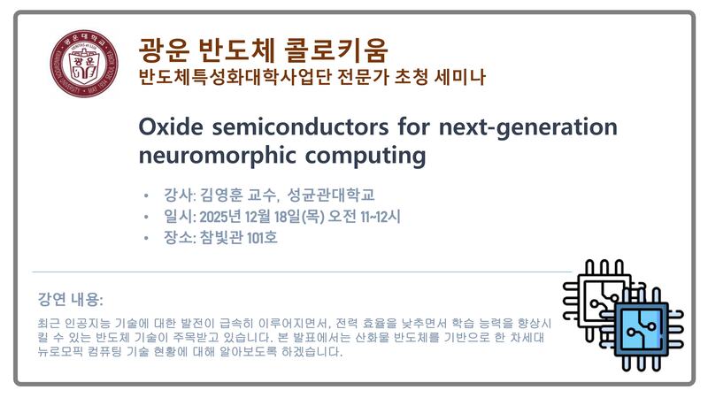 12월 18일(목) | 11:00~12:00 | 김영훈 교수 | 성균관대학교 | Oxide semiconductors for next-generation neuromorphic computing | 참빛관101호 |