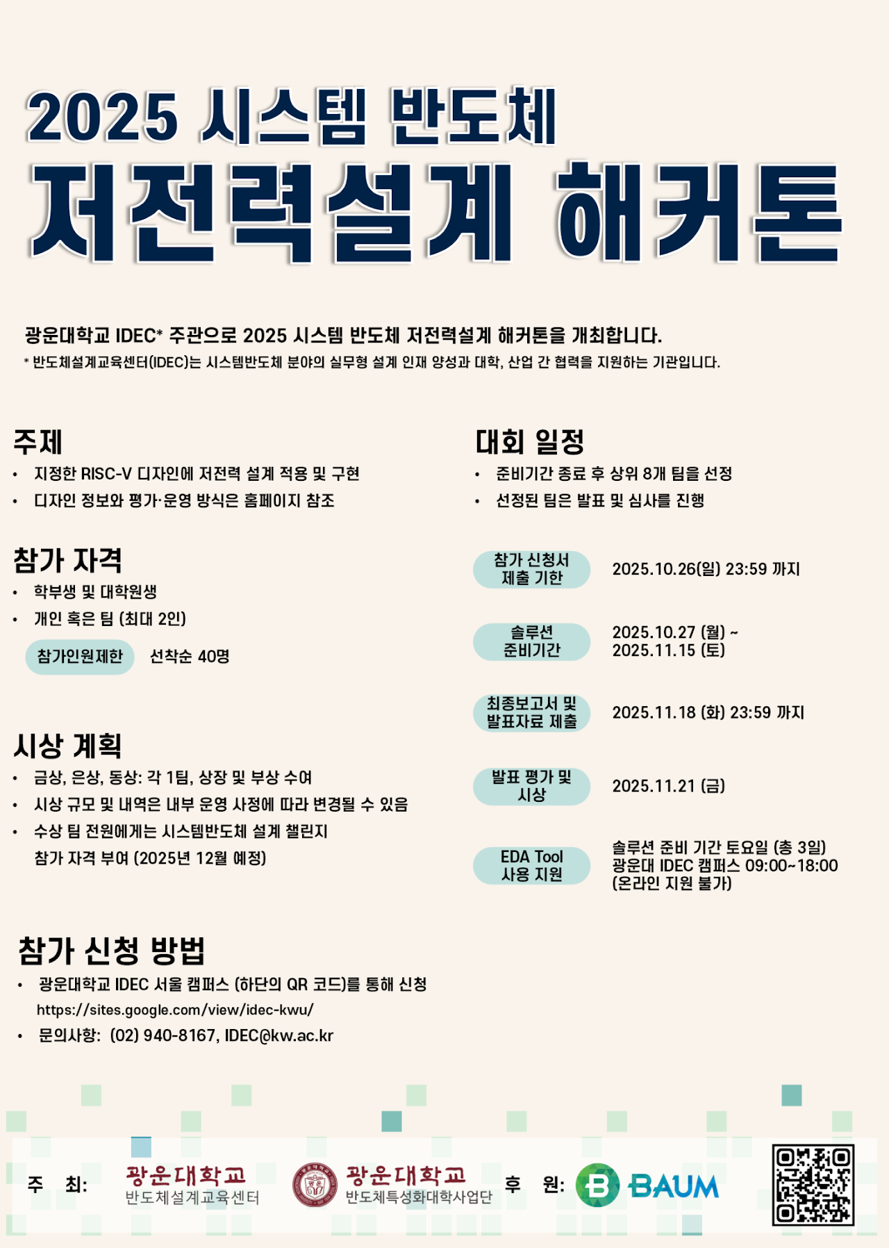 2025 시스템 반도체 저전력설계 해커톤 참여 관련 안내 내용 링크 안내 드리오니 상세내역을 확인 바랍니다.