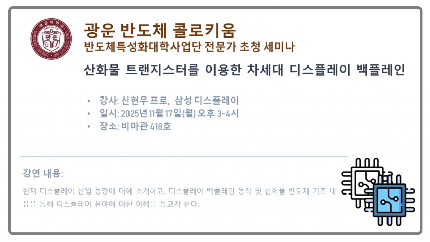 11월 17일(월) | 15:00~16:00 | 신현우 책임연구원 | 삼성 디스플레이 | 산화물 트랜지스터를 이용한 차세대 디스플레이 백플레인 | 비마관 418호 |