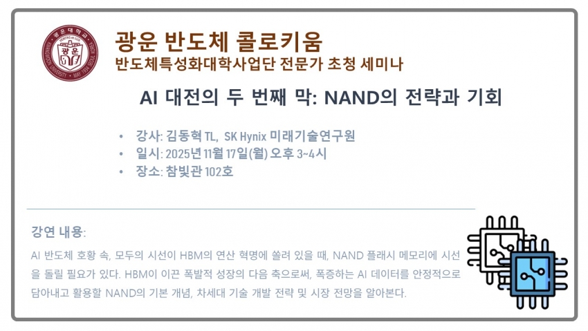 11월 17일(월) | 15:00~16:00 | 김동혁 TL | SK Hynix | AI 대전의 두 번째 막: NAND의 전략과 기회 | 참빛관 102호 |