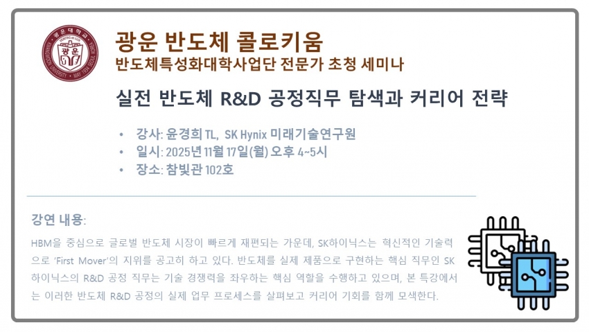 11월 17일(월) | 16:00~17:00 | 윤경희 TL | SK Hynix | 실전 반도체 R&D 공정 직무 탐색과 커리어 전략 | 참빛관 102호 |