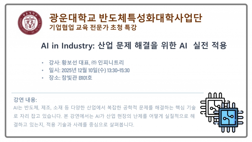12월 10일(수) | 13:30~15:30 | 황보선 대표 | (주) 인피니트리 | AI in Industry: 산업 문제 해결을 위한 AI 실전 적용 | 참빛관B101호 |
