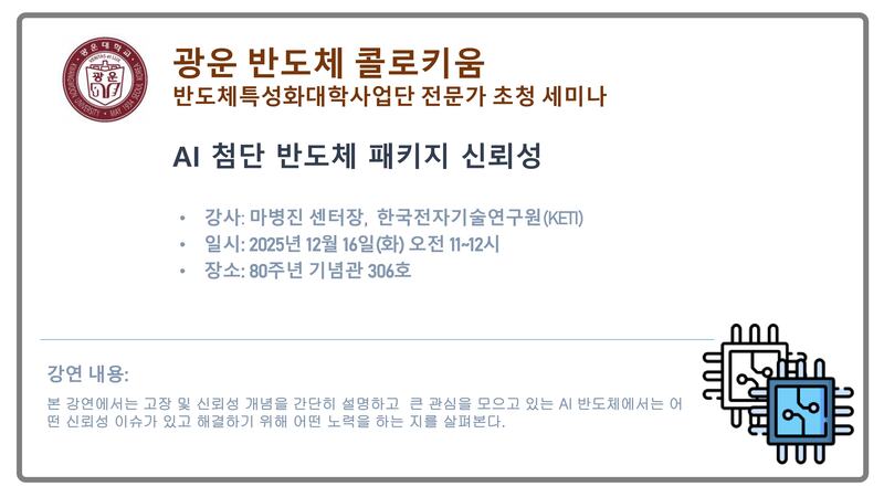 12월 16일(화) | 11:00~12:00 | 마병진 대표 | KETI (한국전자기술연구원) | AI 첨단 반도체 패키지 신뢰성 | 80주년 기념관306호 |